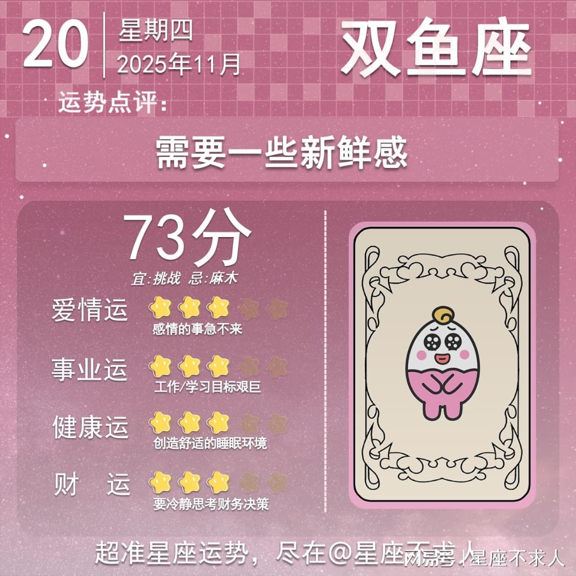 双鱼座今日运势波动较大,事业上可能会遇到一些挑战,需保持冷静应对。爱情方面,有伴侣的双鱼座需多沟通,避免误会;单身者则需耐心等待缘分。财运方面,不宜进行大额投资,需谨慎理财,避免损失。同时,双鱼座今日需注意身体健康,避免过度劳累。