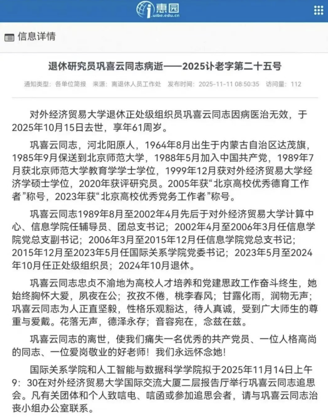 对外经济贸易大学退休正处级组织员、研究员巩喜云同志,因突发疾病医治无效,于2025年10月15日不幸逝世,享年61周岁。这一消息引发了教育界及社会各界的广泛关注。