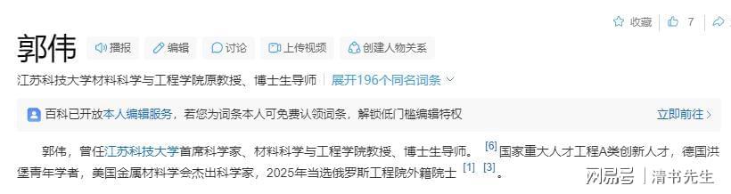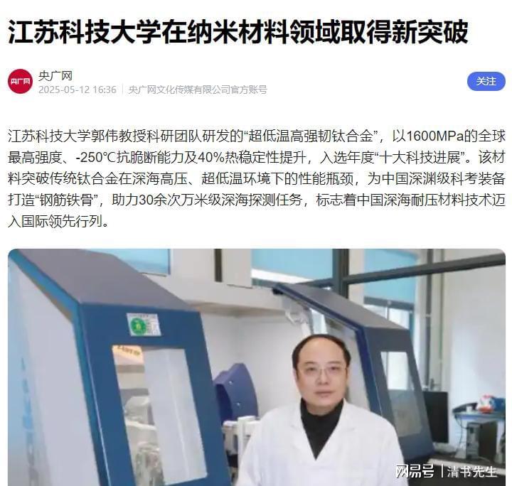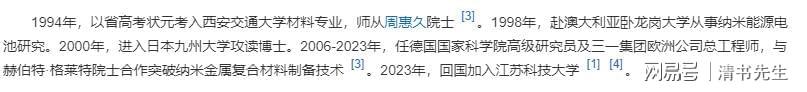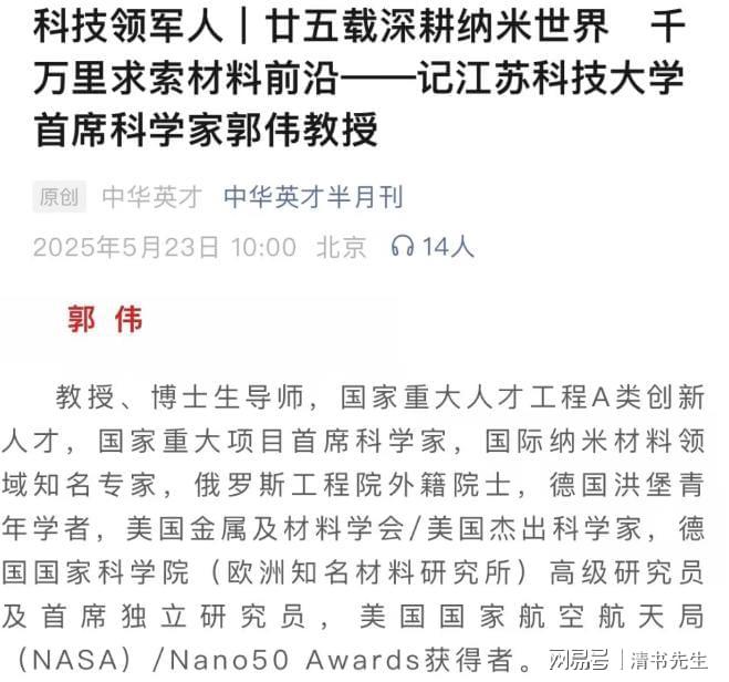 进一步检索发现,郭伟履历堪称“完美”:1994年以省高考状元身份考入西安交通大学材料专业,师从周惠久院士;1998年赴澳大利亚卧龙岗大学从事纳米能源电池研究;2000年在日本九州大学攻读博士;2006-2023年担任德国国家科学院高级研究员及三一集团欧洲公司总工程师;2023年回国加入江苏科技大学。