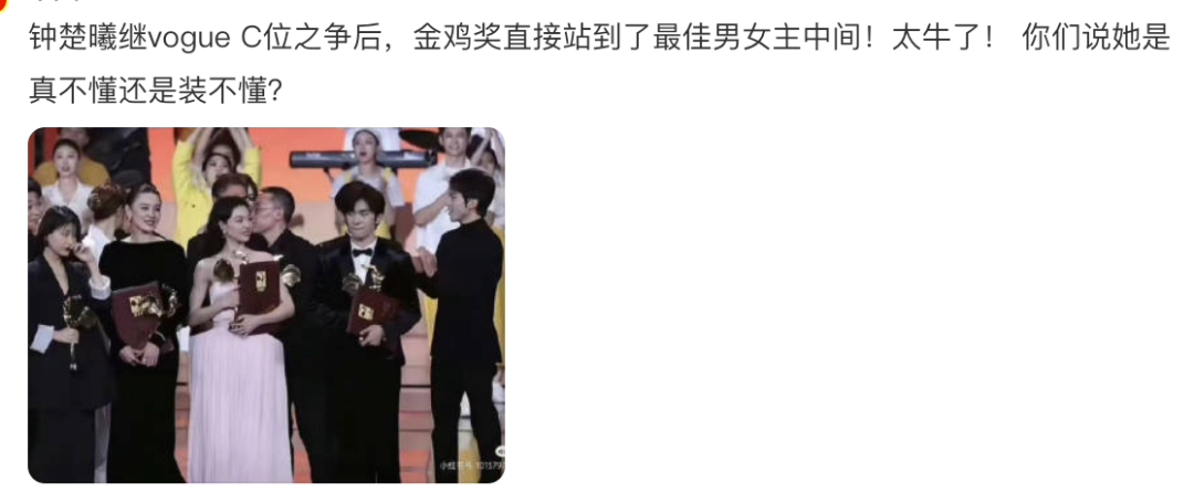 VOGUE盛典上,钟楚曦在合影环节就曾引发过争议。而这次金鸡奖颁奖典礼上,她再次成为了网友关注的焦点。凭借电影《好东西》获得金鸡奖最佳女配角的她,在大合影环节被网友吐槽站在了影帝易烊千玺与影后宋佳之间,成了影帝影后间的C位。