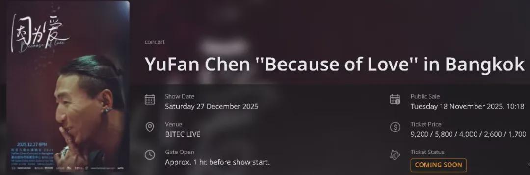 此次公布的海报显示,陈羽凡将于12月在曼谷举办演唱会,售票价格兑换成人民币从370元至2000元不等,价格并不便宜。演唱会福利包括专属席位、签名海报、艺人合影等,与当下爱豆运营模式相似,可以看出其团队对复出赚钱的迫切期望。据泰国本地网友透露,演唱会尚未开售,但已有预告发布。
