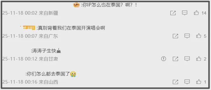 翻阅评论区,发现粉丝们除了祝陈羽凡生日快乐外,还关注到经纪公司的IP地址在泰国,质疑他们是不是一起在泰国准备演唱会。
