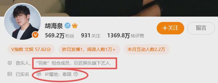 巧的是,胡海泉的IP地址也在泰国,不清醒的粉丝已经开始幻想两人曼谷合体。老实说,若真合体,胡海泉也会惹争议。陈羽凡是违法劣迹艺人,若胡海泉选择在公开场合合体,就是牺牲自己的职业生命,也让当初不知情的切割成为笑话。