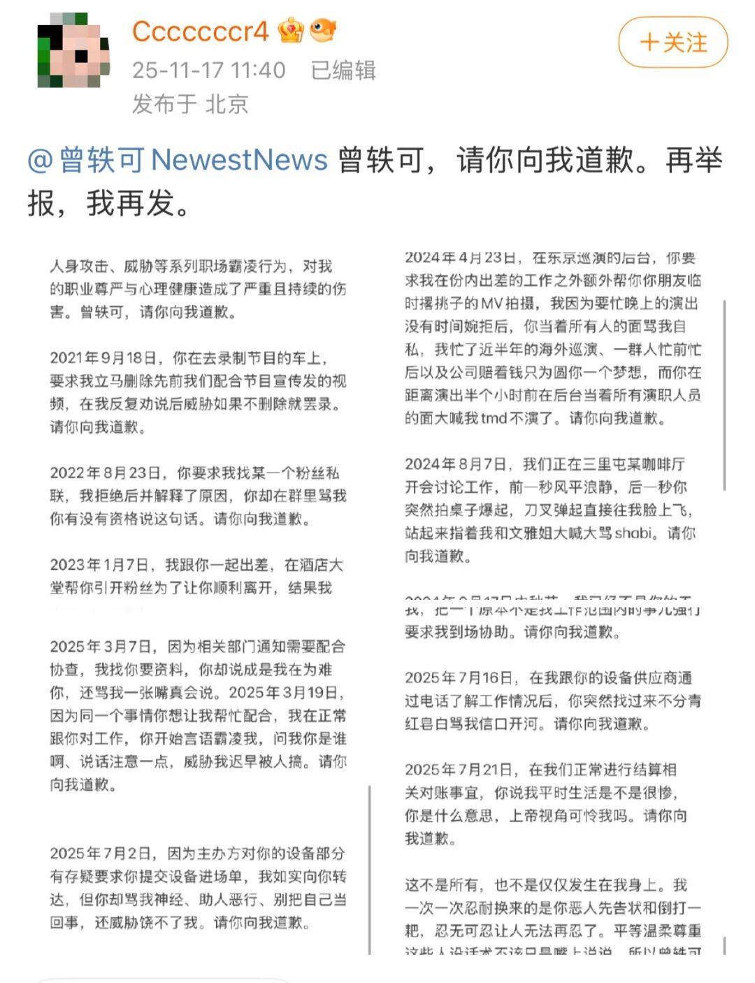 11月17日,一位自称是曾轶可前工作人员的网友,在微博发长文,详细控诉了自己在工作中遭受了来自曾轶可的职场霸凌,包括但不限于: