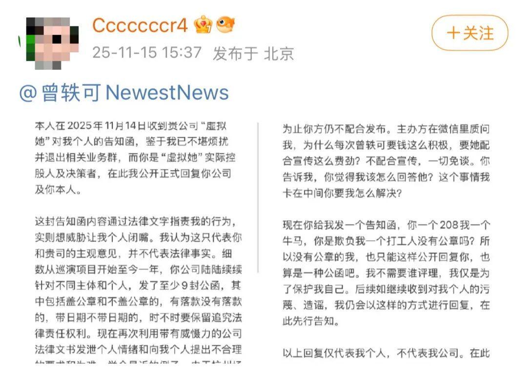 而这,也并非这位网友的第一次控诉,早就八月,她已经在微博不点名内涵,直到11月,她自称收到了曾轶可公司的告知函,才开始带大名发文。