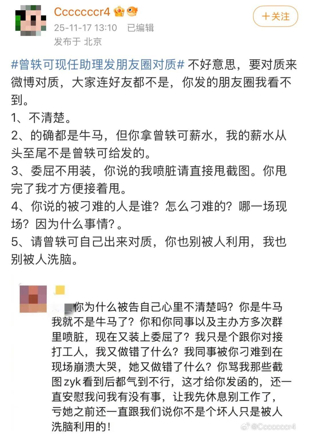 但很快,曾轶可的现任助理,就在朋友圈发文回击了。