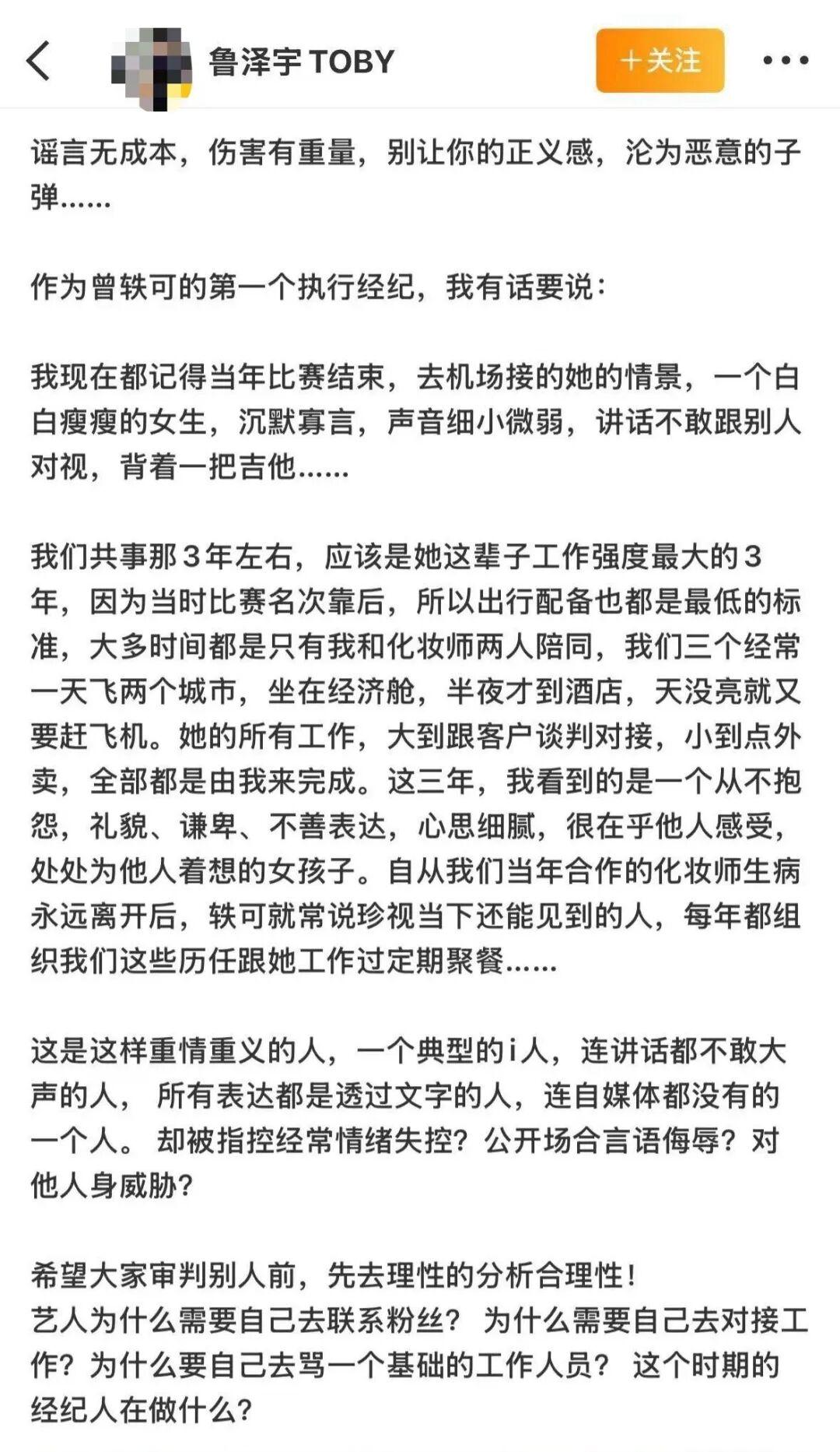 而且与此同时,不少曾轶可合作过的对象、前经纪人和助理,以及一些乐评人和音乐人都出来替她说话,大意都是她是一个比较内向的人,不太会做这样的事。