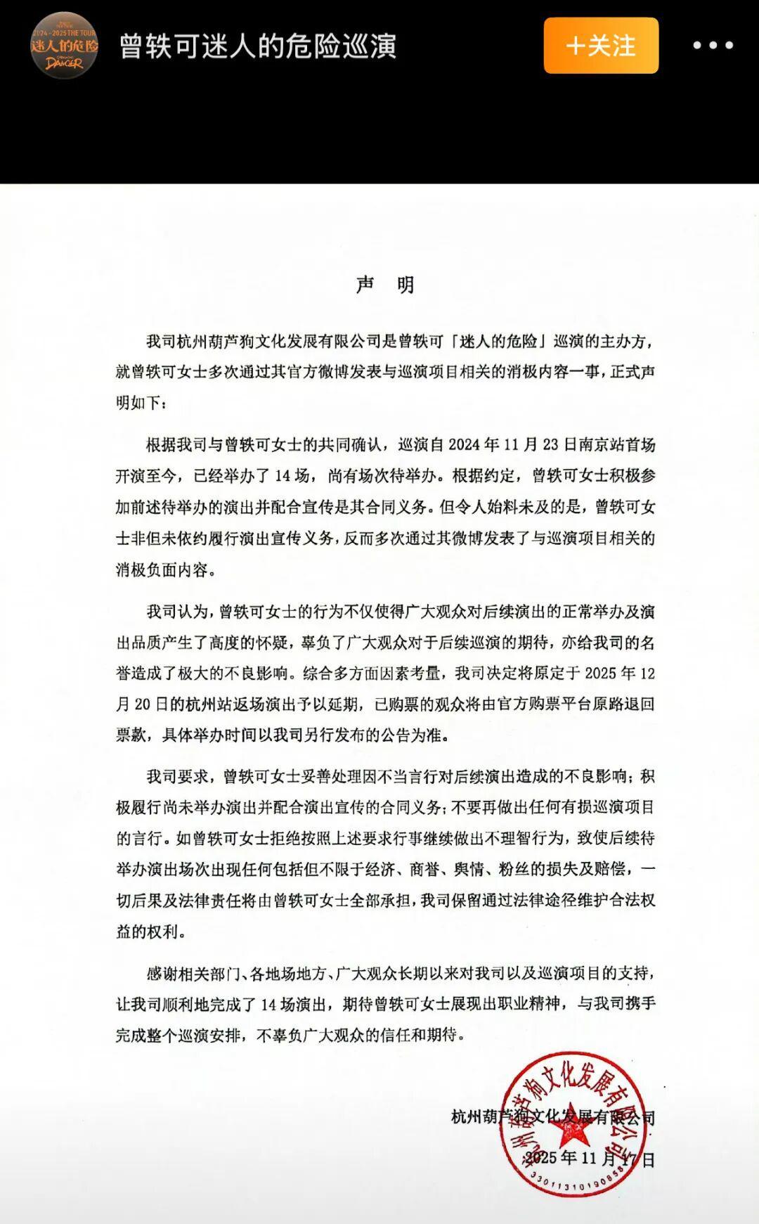 声明里指责曾轶可多次在微博发与巡演相关的消极内容,导致票房崩盘,于是决定将杭州站的演出延期。