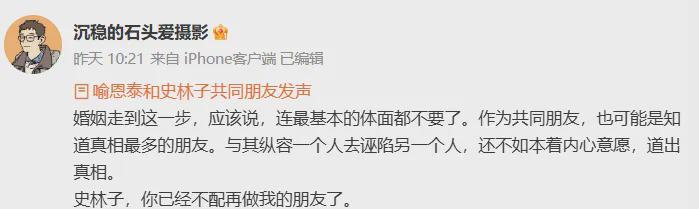 很快,反转就来了,11月18日,一位名叫“沉稳的石头爱摄影”的网友,自称是老叔和史林子的共同朋友,他爆料两人的离婚原因,是史林子多次出轨被抓包。