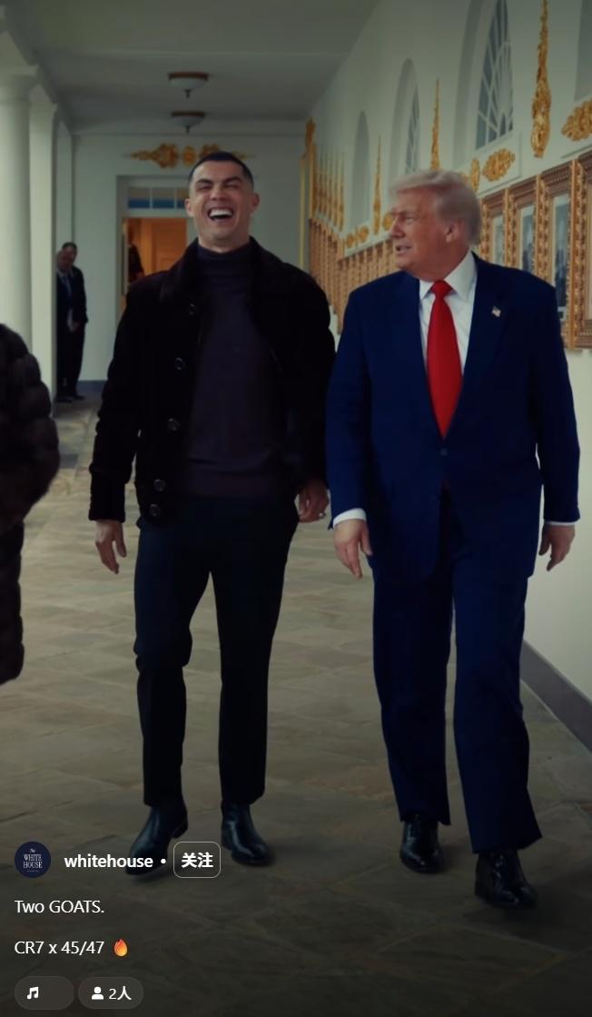 北京时间11月19日晚,一则引发全球体育与政治领域热议的消息传来:白宫与C罗官方社交媒体账号联合发布动态,公开了一段C罗与美国前总统特朗普在白宫走廊并肩散步的珍贵视频片段。配文“Two GOATS(两位历史最佳)”的标注,瞬间点燃了网络讨论热潮。