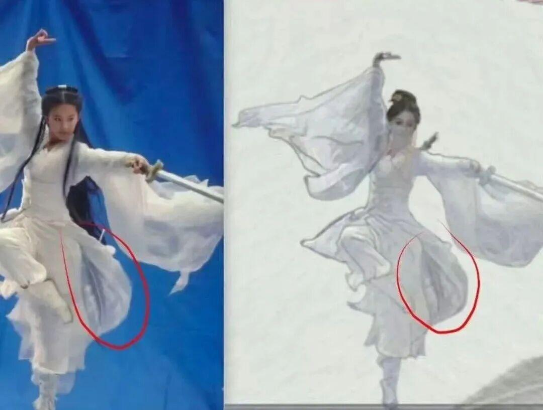 网友对比发现,毛林林角色海报中的整体姿势、右手衣服褶皱与形状,与刘亦菲在经典剧集《神雕侠侣》中饰演的“小龙女”造型高度重合。甚至衣服被风吹起的弧度、白裙映出的黑发轮廓等细节都极为相似,仅在脸部特征和领口细节上存在差异。更引人注意的是,毛林林角色领口仍保留了类似小龙女造型的花瓣元素,疑似设计师直接挪用原有素材进行“换脸”创作。对此,不少网友建议剧方后续应避免与该设计师合作,以维护作品原创性。
