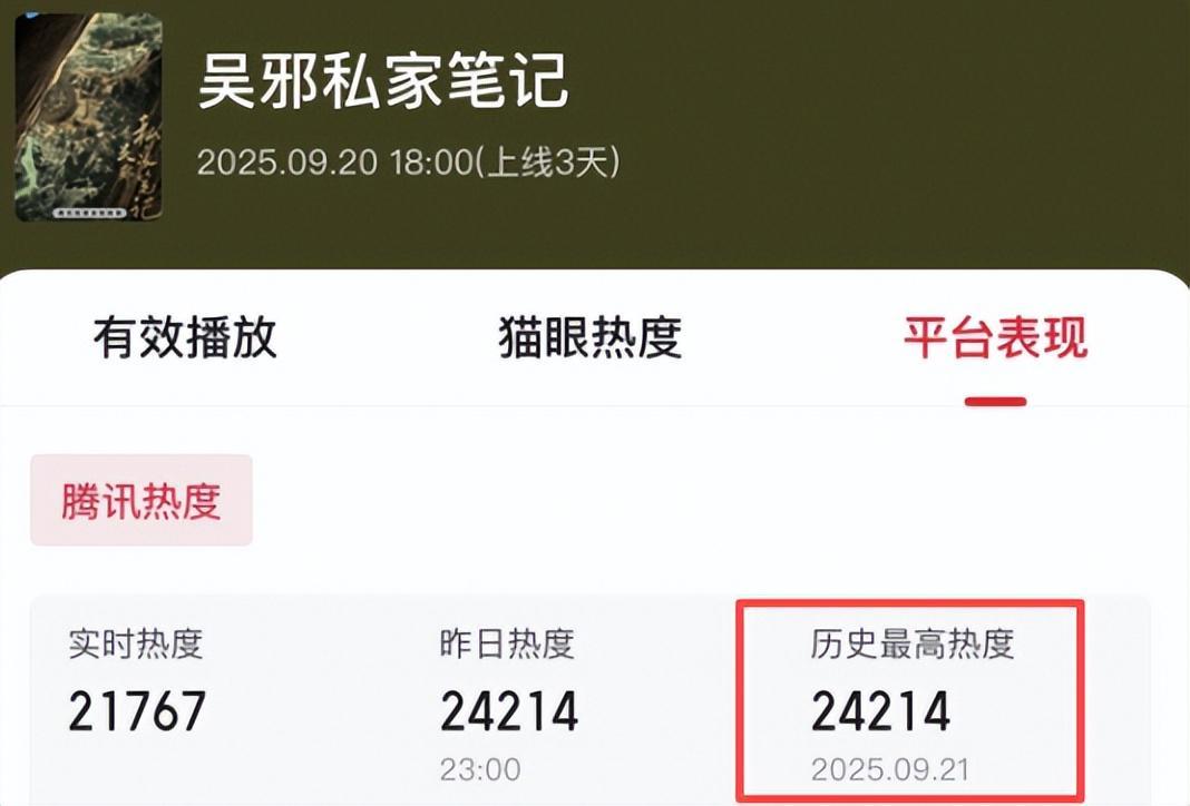 《吴邪私家笔记》上线勇夺站内9.2的高分,热度更是飚升至24000,成绩势如破竹。