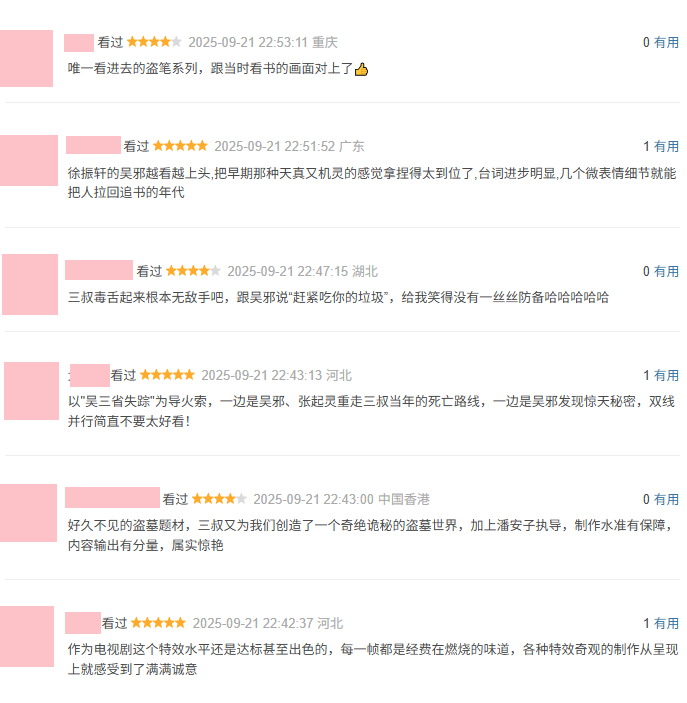 剧集还原度高,节奏快而不乱,在推进主线盗墓、寻人等剧情时,也将各色人物的不同个性展现的淋漓尽致,让观众轻松沉浸到剧中,无法自拔。
