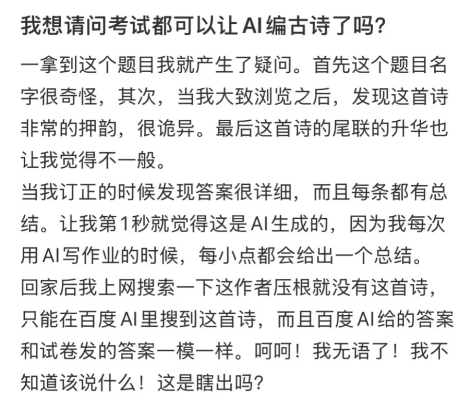 尤其是最近部分地方语文教育严重依赖AI,有老师让孩子直接背AI给的范浓浓的人机感;有学校用AI出试卷,错漏百出,家长吐槽声不断。