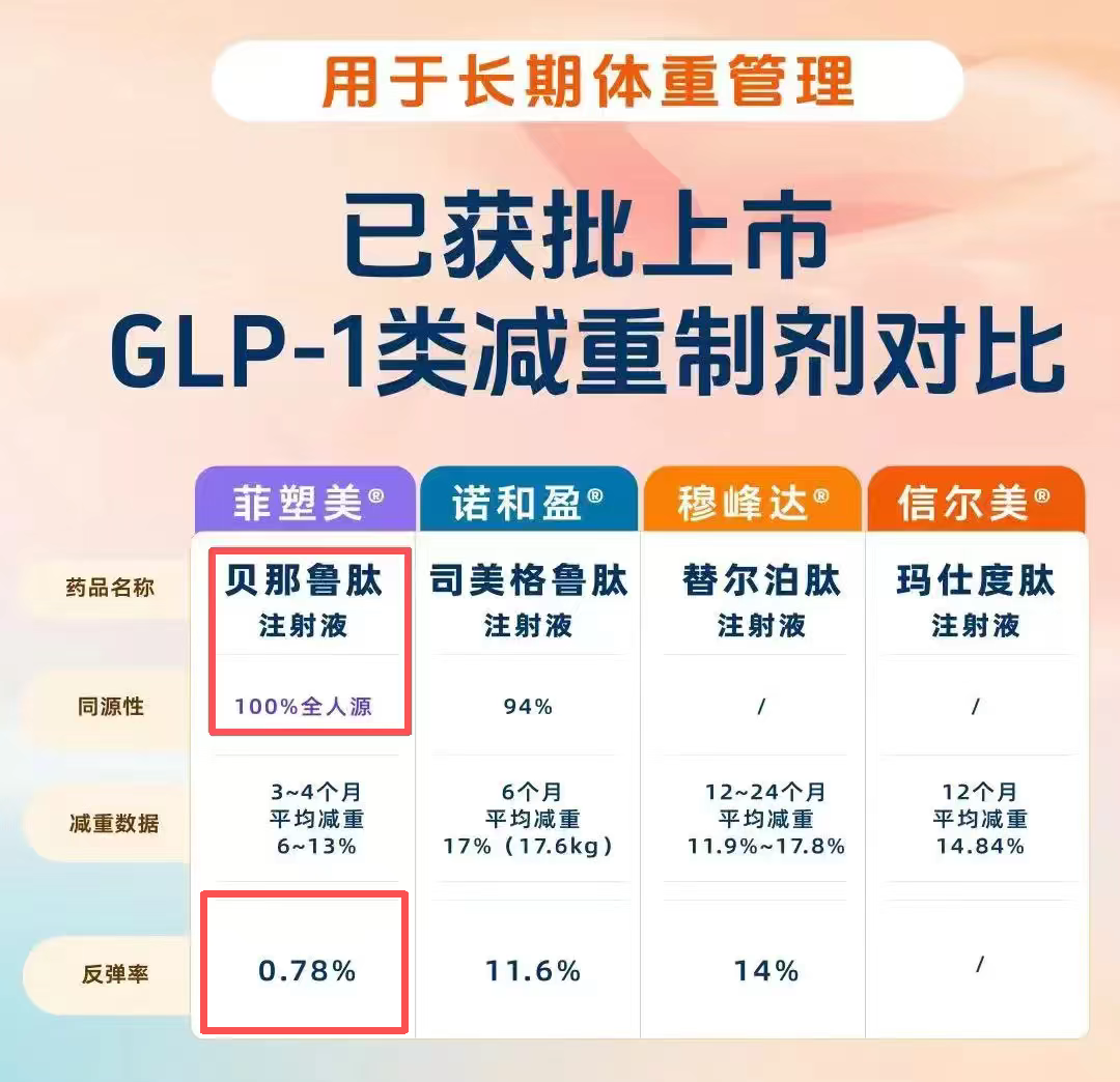 相比于更有名气的司美格鲁肽,贝那鲁肽虽然在减重上没有那么追求快,但优势在于:100%全人源、反弹率低、人群适用范围广