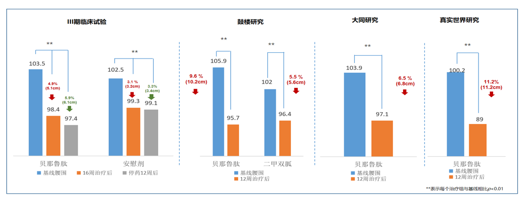 而贝那鲁肽可谓是腰腹肉肉“克星”!在实验数据中,用药3~4个月,减少腰围5~11cm!