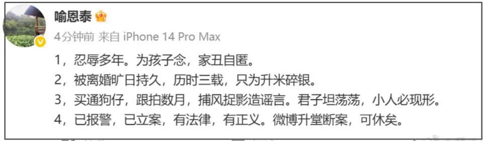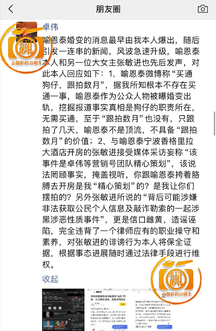 男演员喻恩泰的婚变风波持续发酵,几方人马陆续下场发声,每个人都各执一词,让网友直呼这场“大戏”太过抓马。目前,首曝喻恩泰婚变消息的卓伟,也在朋友圈发文回应了此事。