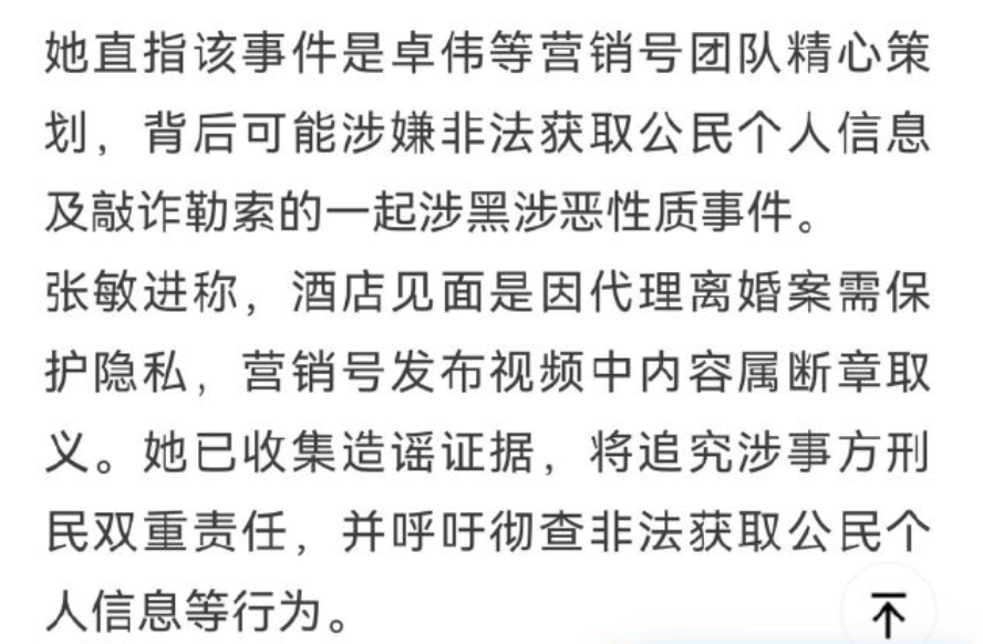 同时,卓伟否认非法获取公民个人信息及敲诈勒索,痛批张敏进造谣诬陷,违背了一个律师应有的职业操守和素养。他表示将保全证据,根据事态进展随时通过法律手段进行维权。