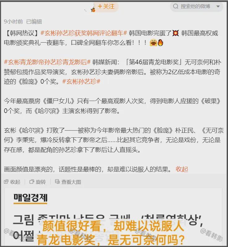 韩媒对青龙奖的获奖名单提出了尖锐批评,特别是针对玄彬和孙艺珍携手拿奖一事,直言夫妻二人获奖缺乏说服力,质疑奖项的公正性。