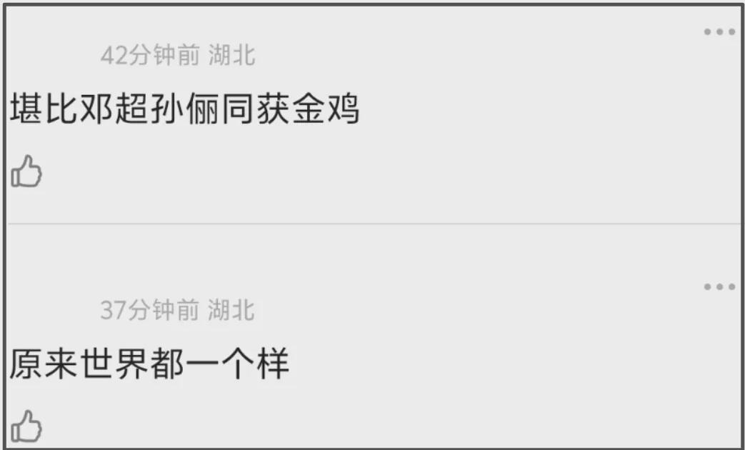 文素利的表现瞬间让人想起了为好友迟蓬鸣不平的倪萍。当年倪萍站在金鸡奖舞台上,直接就来了一句:“(迟蓬)你还傻坐在这了,根本就没有你(的奖)”。这一幕,与青龙奖颁奖礼上的文素利如出一辙。