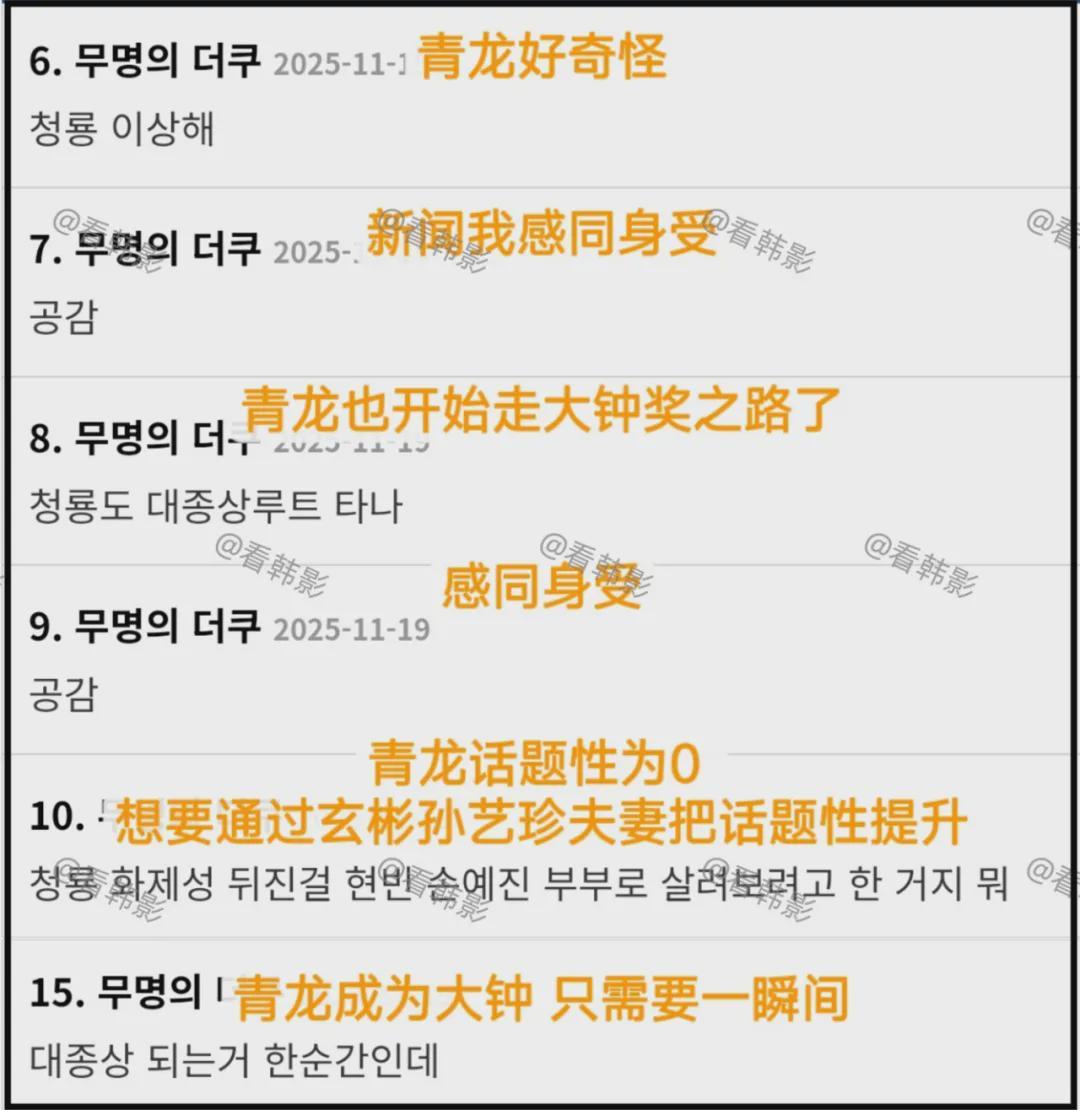 韩网相关报道的评论区更是一片哗然,网友们的吐槽声此起彼伏,对青龙奖的公正性提出了严重质疑。