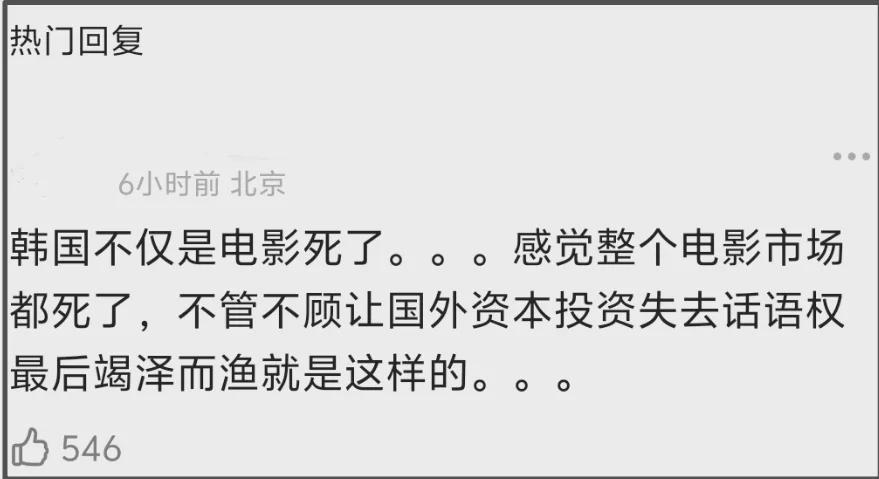 庆幸的是,因为本土市场足够庞大,中国电影还有机会。在网友看来,从韩剧到韩影彻底被欧美资本入侵,丢掉了自身优势,相当于自己把自己推进了绝路。