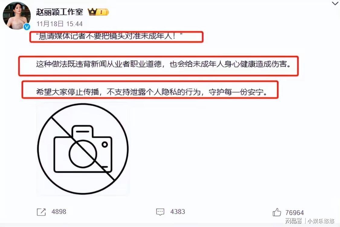 这是赵丽颖工作室在本月18日于社交平台发出的强烈呼吁,旨在希望大家停止传播赵丽颖儿子的信息,保护孩子的隐私。