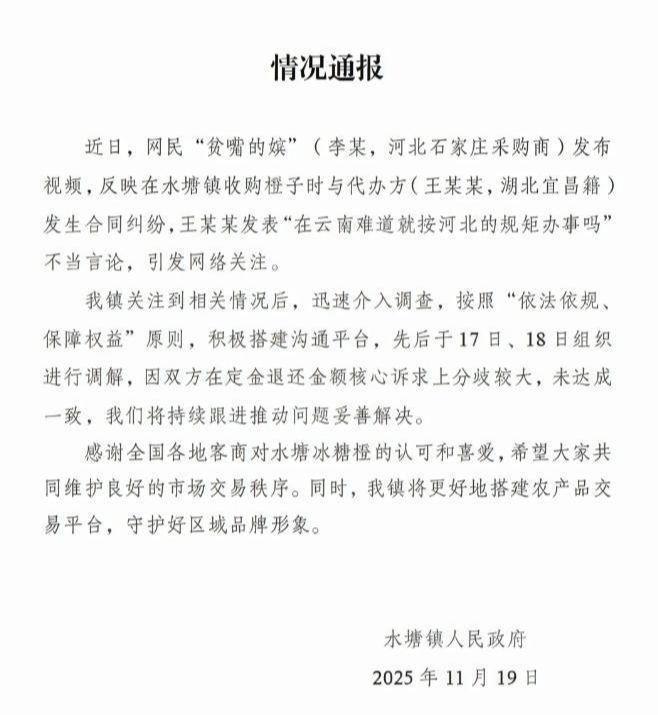 李先生表示,坚持维权不仅是为了追回损失,更是不想让后续来此的客商再遭同样遭遇。11月19日,云南玉溪水塘镇人民政府针对此事发布官方通报,确认纠纷双方为河北采购商李某与湖北宜昌籍代办王某某,明确王某某发表了不当言论,并表示已先后于11月17日、18日组织调解,因定金退还金额分歧未达成一致,将持续跟进推动问题妥善解决。