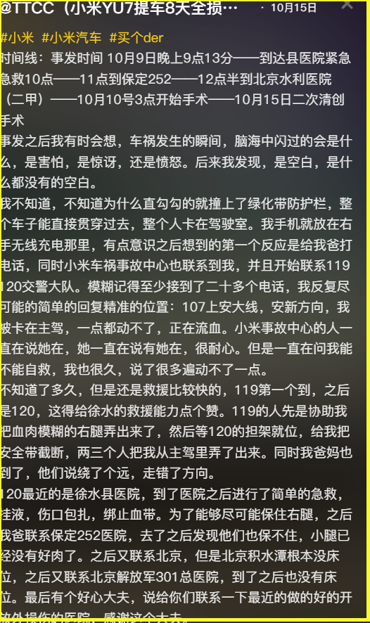 10月2日,喜提心心念念的小米YU7;10月9日晚上九点,仅仅过了8天时间,总里程998公里,一场突发事故,迎来了他人生的转折点,不是向上,而是向下。让他损失了一条右小腿,何其不幸。