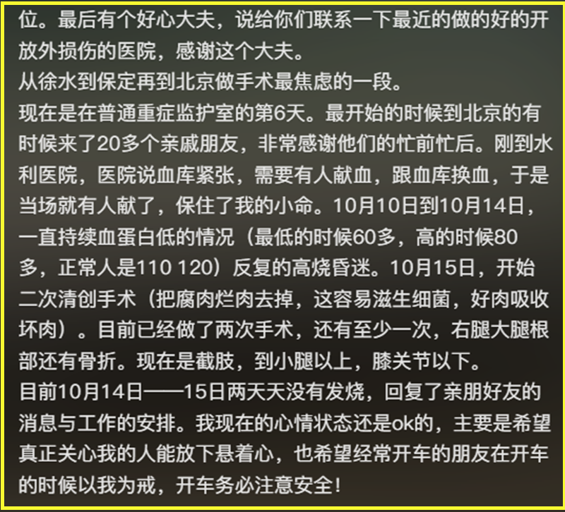 一位缺少一只手的残疾网友,看到车主的遭遇,已经推想出,车主未来生活中,对自己失去右小腿的行动不便,会愤怒、会悔恨。