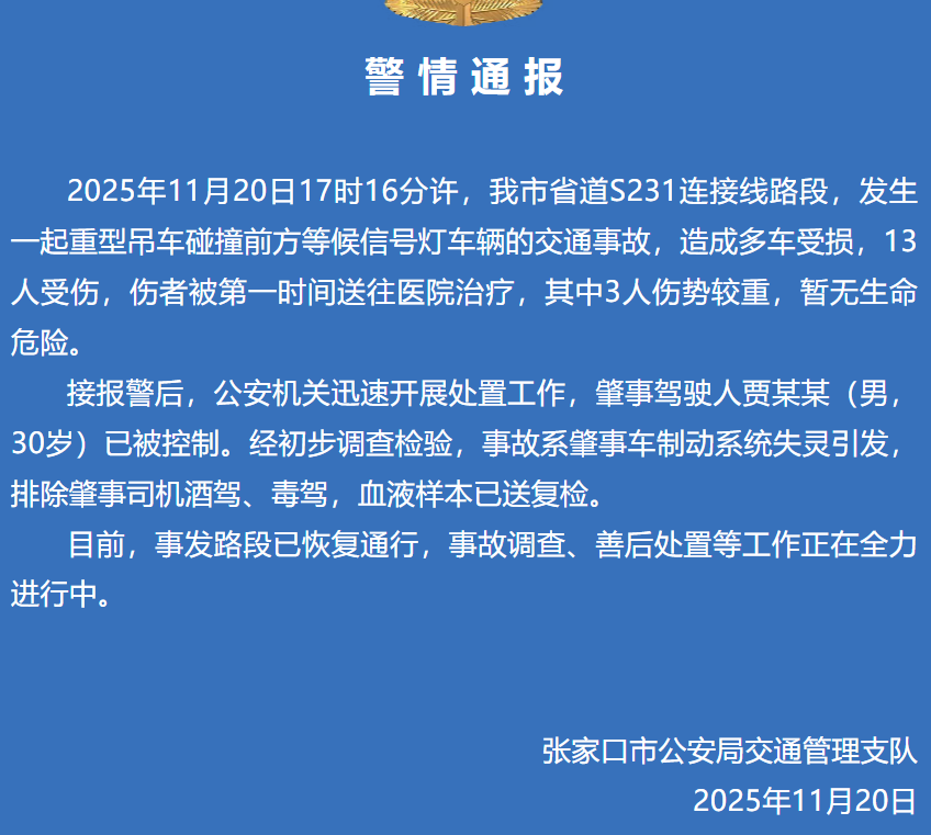 11月20日,张家口市公安局交通管理支队发布最新通报:当日17时16分许,在省道S231连接线路段发生一起严重交通事故,一辆重型吊车因制动系统失灵,追尾碰撞前方正在等候信号灯的多辆机动车,造成现场多车受损、13人受伤的后果。