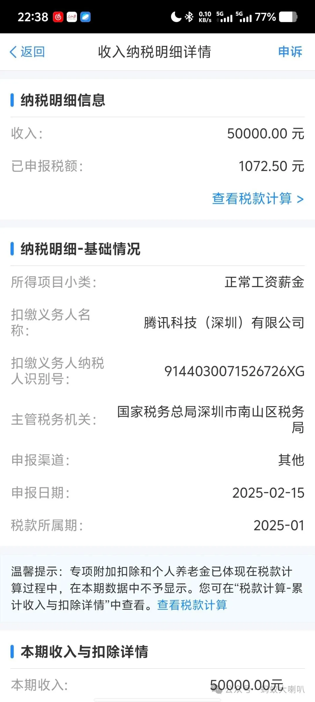 从该网友发布的截图来看,个税扣缴义务人显示为鹅厂,这表明该员工此前曾在鹅厂任职。虚构工资流水的目的,很可能是为了在新公司获得更好的薪资待遇。然而,这种贪小便宜的行为最终却让他付出了沉重的代价。