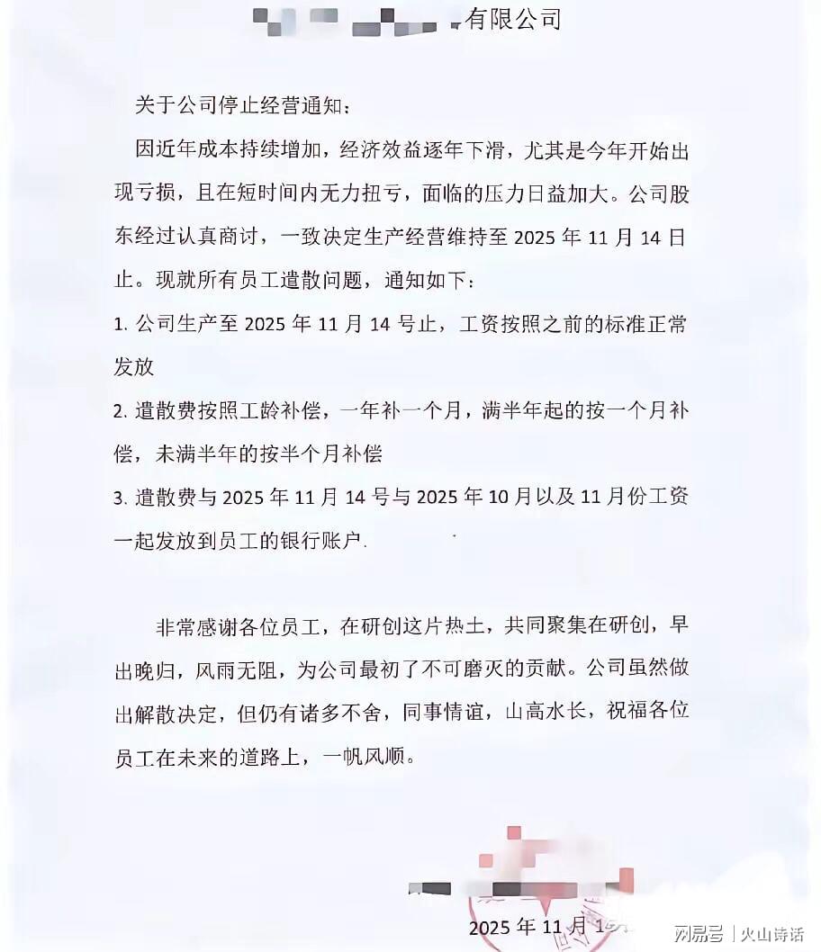 因近年成本持续增加,经济效益逐年下滑,尤其是今年开始出现亏损,且在短时间内无力扭亏,面临的压力日益加大。公司股东经过认真商讨,一致决定生产经营维持至2025年11月14日止。现就所有员工遣散问题,通知如下: