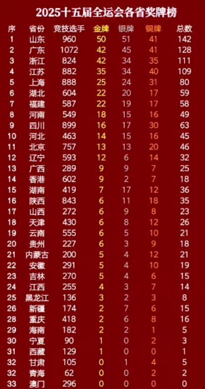 目前,山东队已领先第二名8金,若无意外将连续五届登顶金牌榜。广东与浙江的榜眼之争将持续至最后一个比赛日,江苏队第四名位置相对稳固。湖北、福建等队仍有机会冲击更高排名,全运会最终奖牌榜格局即将揭晓。