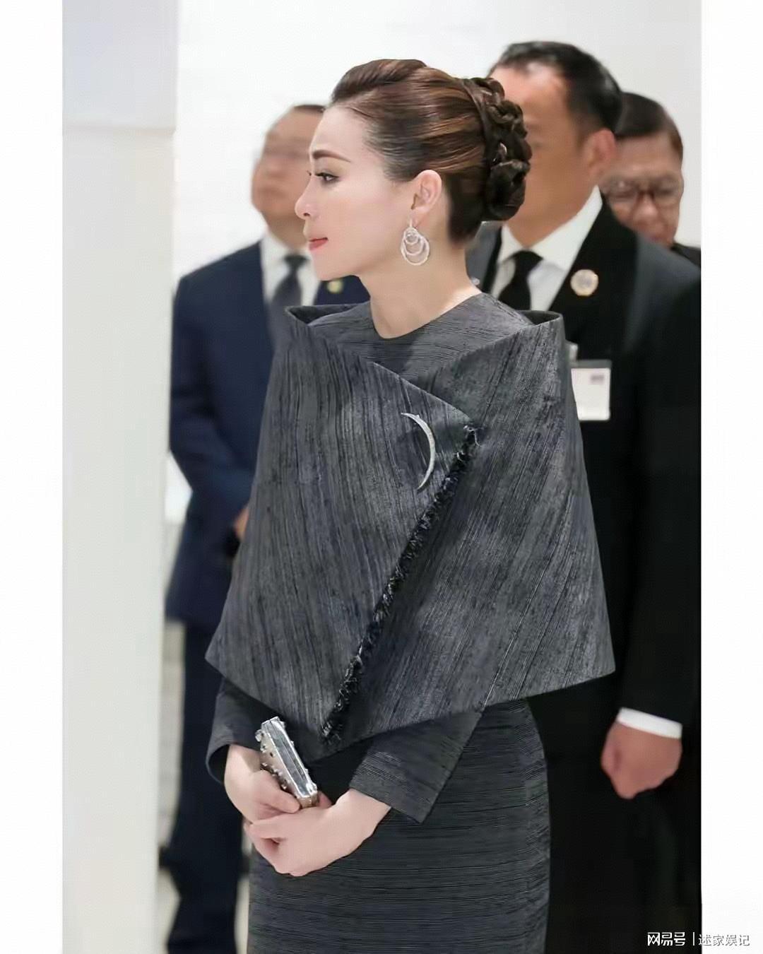 在这组写真中,苏提达王后身着一件灰色长袖连衣裙,肩部独特的斗篷设计打破常规,为整体造型注入新意。这种设计不仅增添了层次感,更巧妙地修饰了肩部线条,尽显大气与端庄。搭配黑色细高跟鞋,瞬间拉长身形比例,凸显出她高挑修长的身姿,每一步都散发着自信与从容。
