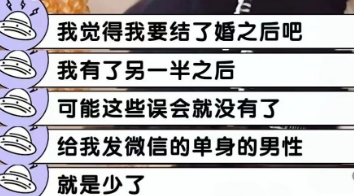 除了这些,董璇还透露了一个重要的考量因素,那就是“结婚后可以减少很多社交烦恼”。她解释说,刚离婚单身时,与导演、制片人等男性多说几句话,就会遭到他们妻子或女朋友的误解,甚至用猜忌的眼光看待她。而有了另一半后,这些误会便大大减少了,给她发信息的男性也少了。