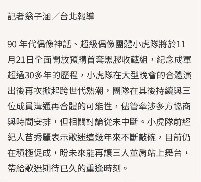 事情的起因,是为纪念小虎队成军超过30周年,11月21日,其首套黑胶收藏组全面开放预购。这一举动不仅勾起了无数人对那段青葱岁月的回忆,更让小虎队合体的呼声再次高涨,仿佛一夜之间,大家又回到了那个充满阳光与梦想的年代。