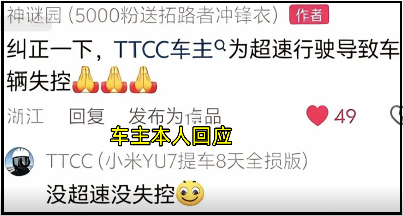 对于网友们的猜测,当事人正面回应:“没超速,没失控”。