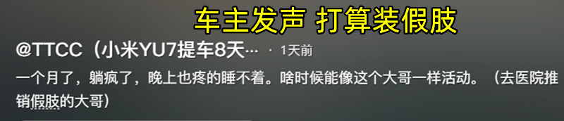 10月2日,喜提心心念念的小米YU7;10月9日晚上九点,仅仅过了8天时间,总里程998公里,一场突发事故,迎来了他人生的转折点,不是向上,而是向下。让他损失了一条右小腿,何其不幸。