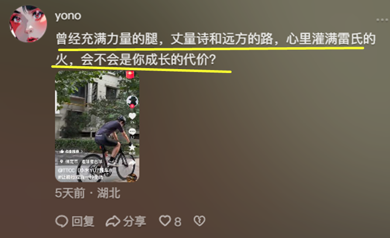 在车主作品的评论区中,有网友进行了安慰,也有网友对于车主的选择进行了踩踏:“曾经充满力量的腿,丈量诗和远方的路,心里灌满雷氏的火,会不会是你成长的代价?”