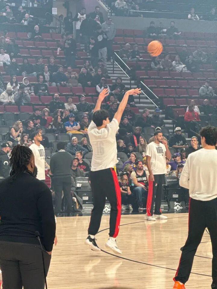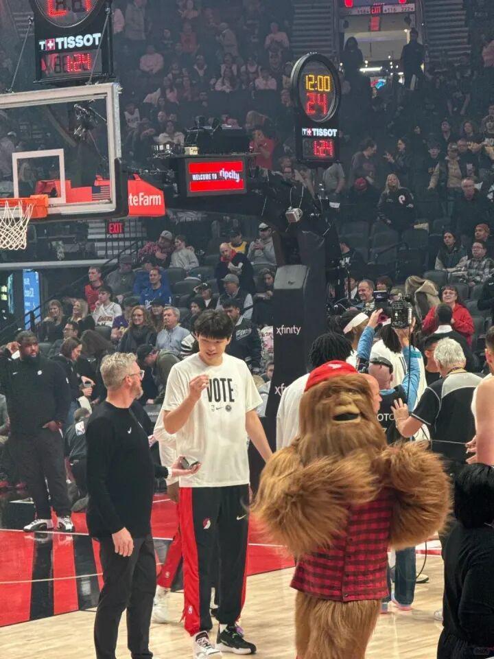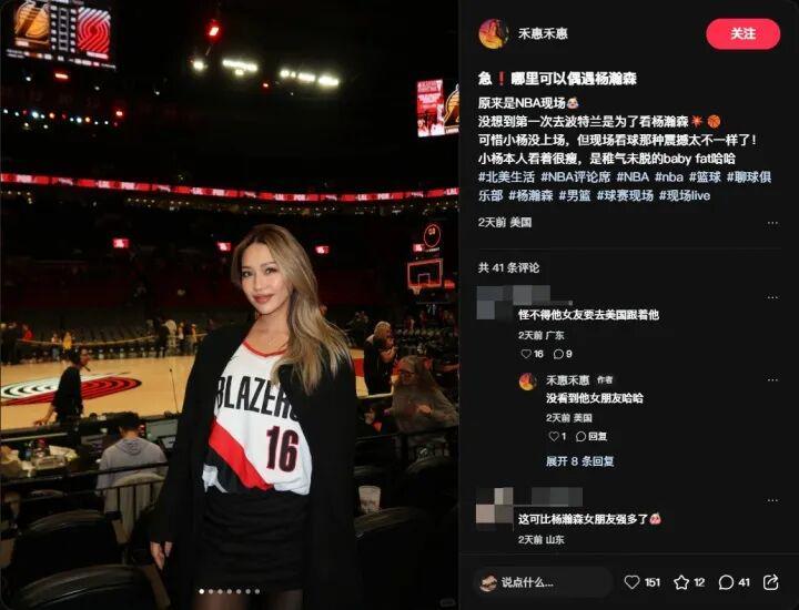 她在社交媒体上分享了自己的观赛体验,写道:“没想到第一次去波特兰竟然是为了看杨瀚森的比赛,虽然可惜小杨这次没有上场,但现场看球的那种震撼感真的太不一样了!而且,小杨本人看起来真的很瘦,脸上还带着稚气未脱的babyfat,哈哈。”