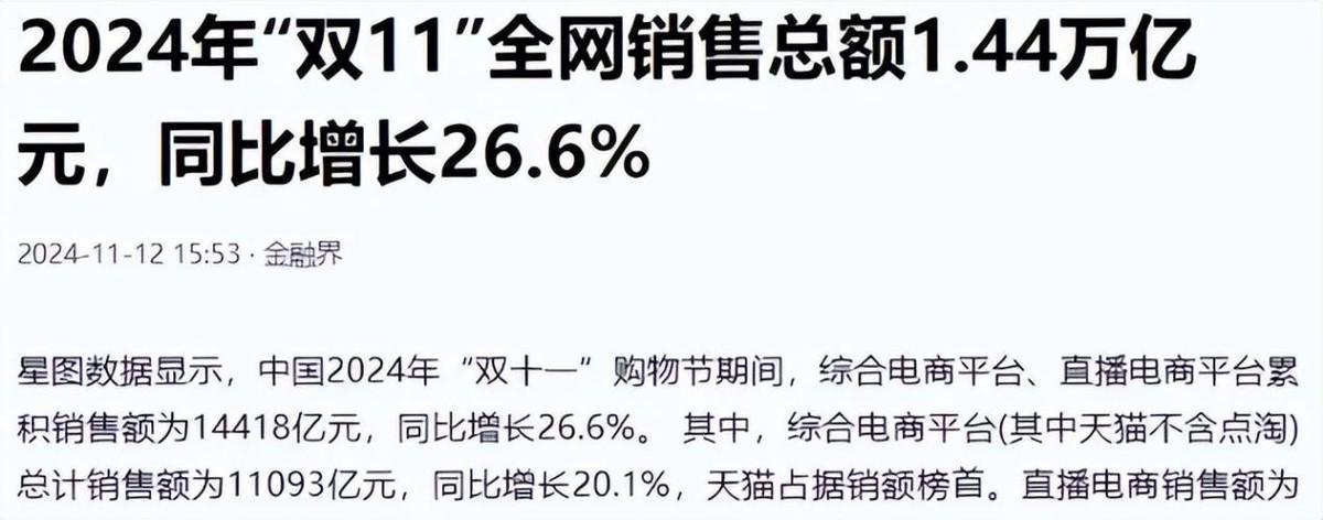 2023年双十一全平台销售额1.13万亿元,2024年直接冲到1.44万亿元。