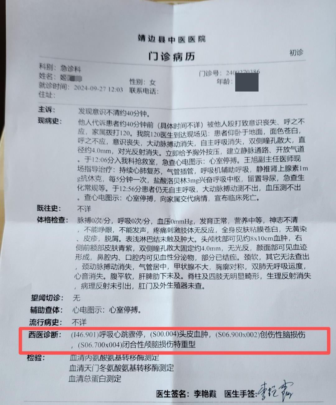 据王女士提供的靖边县中医医院门诊病历显示,王女士的母亲姬某利西医诊断为呼吸心跳骤停、头皮血肿、创伤性脑损伤、闭合性颅脑损伤特重型,建议家属在进行尸体料理的同时,也进行尸体解剖明确病因,就诊时间为2024年9月27日12时3分。另据王女士提供的居民死亡医学证明(推断)书显示,姬某利死亡原因为闭合性颅脑损伤,死亡日期为2024年9月27日,死亡地点为靖边县中医医院。