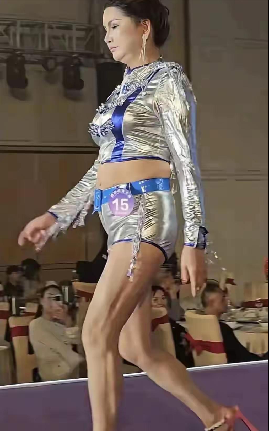 从视频画面来看,这位冠军选手大约四十岁上下,体态偏圆润。她身着的白色礼服虽镶有闪钻,但从侧面看,肚子上的赘肉十分明显,后脑勺还能看到几根白发。