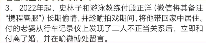 2022年,史林子和其游泳教练付某长期偷情,在微信上给他备注“携程客服”,并在喻恩泰拍戏期间,胆大到带他到自己家中居住。