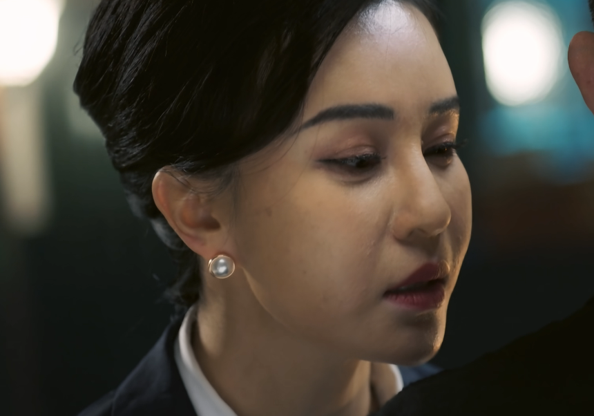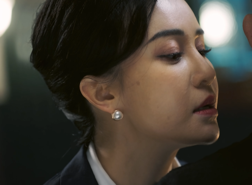 如果说母其弥雅的“面具脸”已够惊悚,剧中另一位女演员秋荷的“网红脸”则更显突兀。她出场时最抢镜的便是那快戳穿屏幕的鼻尖:扁平山根与“拔地而起”的鼻梁形成强烈反差,鼻翼扩张后仿佛在用鼻孔看人。