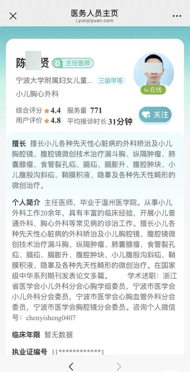 出于对孩子的重视和担心,她们当天又挂了宁波市妇女儿童医院心脏科医生陈某某的号,进入就诊室后,陈某某不在,陈某某对面的医生帮忙看了报告,看完后第一句话就是“你这个情况肯定要手术的”。