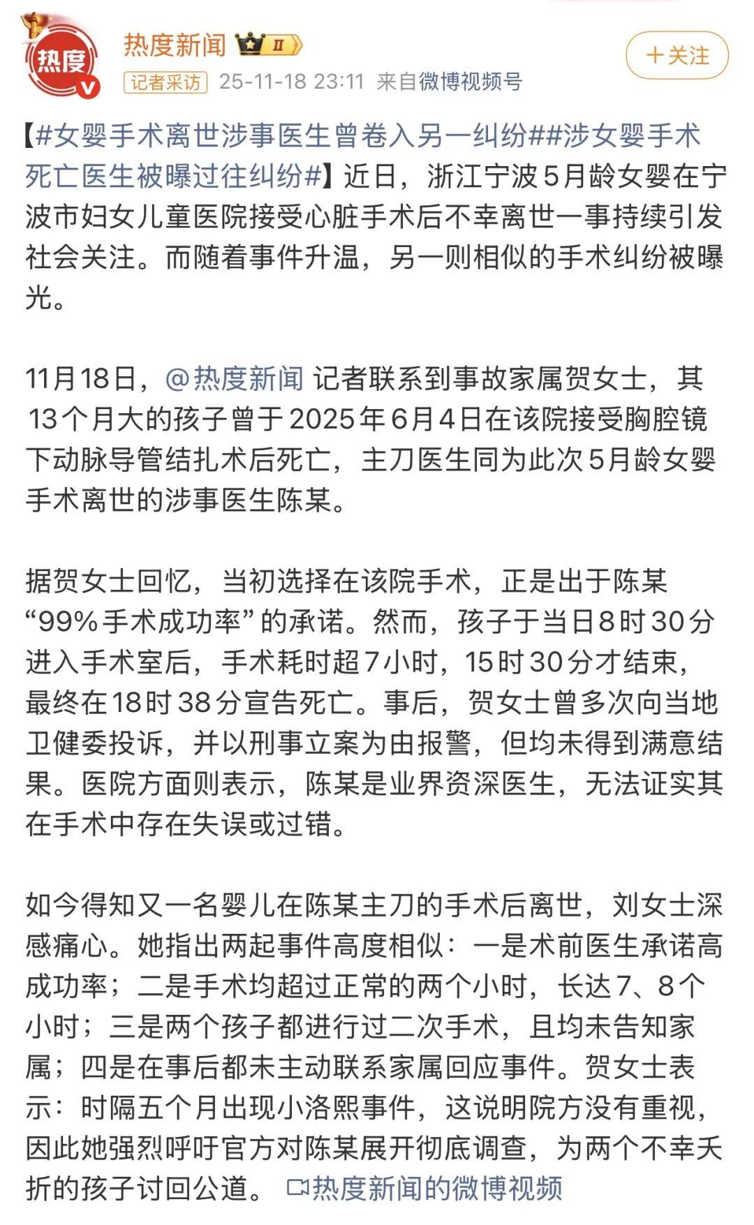 目前事件已进入法定医疗纠纷程序,家属与社会期待真相早日厘清,推动婴幼儿手术风险评估与医患沟通机制的完善。