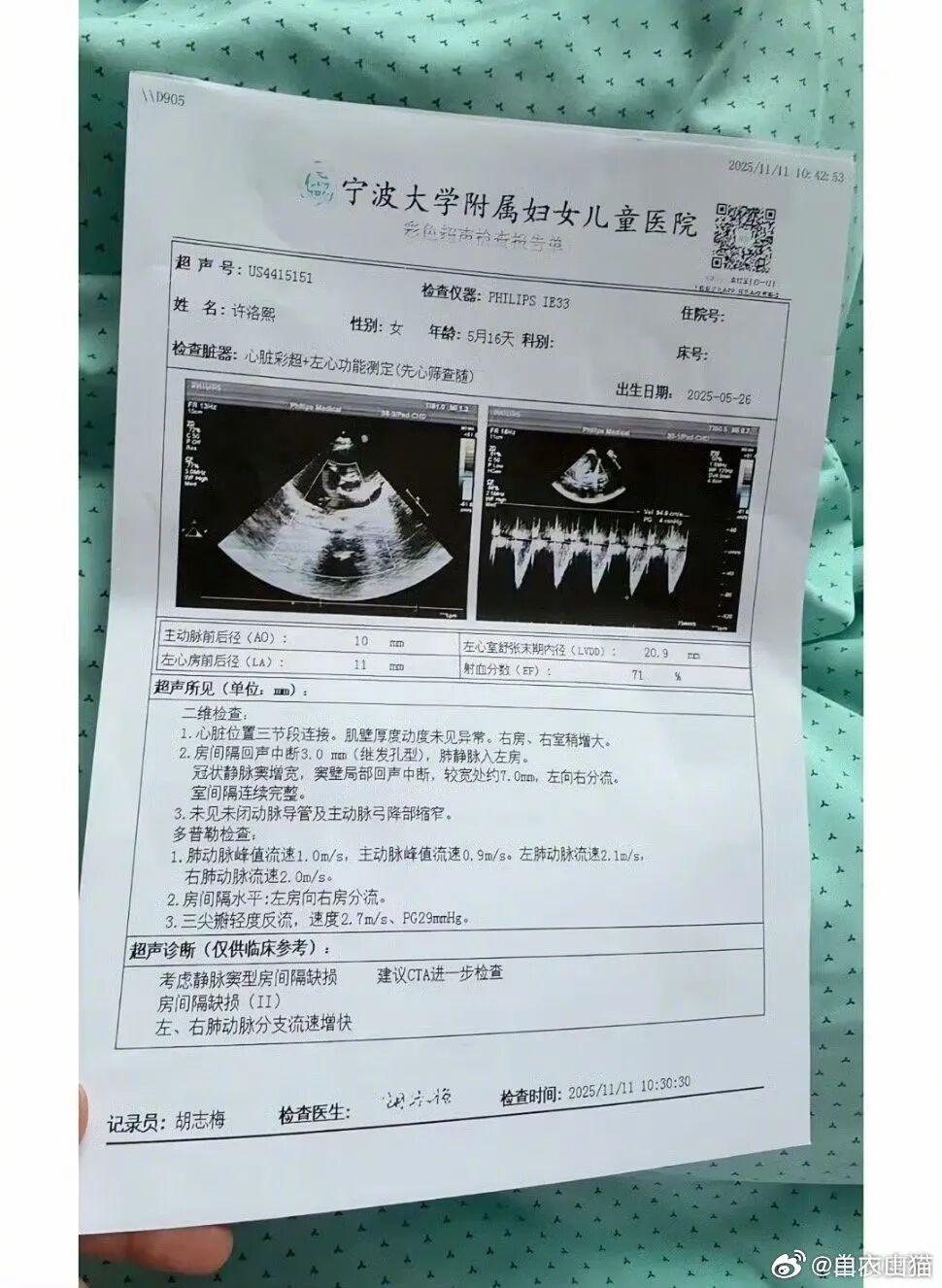 2025年11月11日的常规检查也显示孩子各方面的情况不错,但医生说早产儿一般都要再查一下脑部核磁共振、心脏彩超和听力,因为之前医生也提过几次,所以邓女士就听取了建议要做这三项检查,并在当天上午给孩子做了全麻。