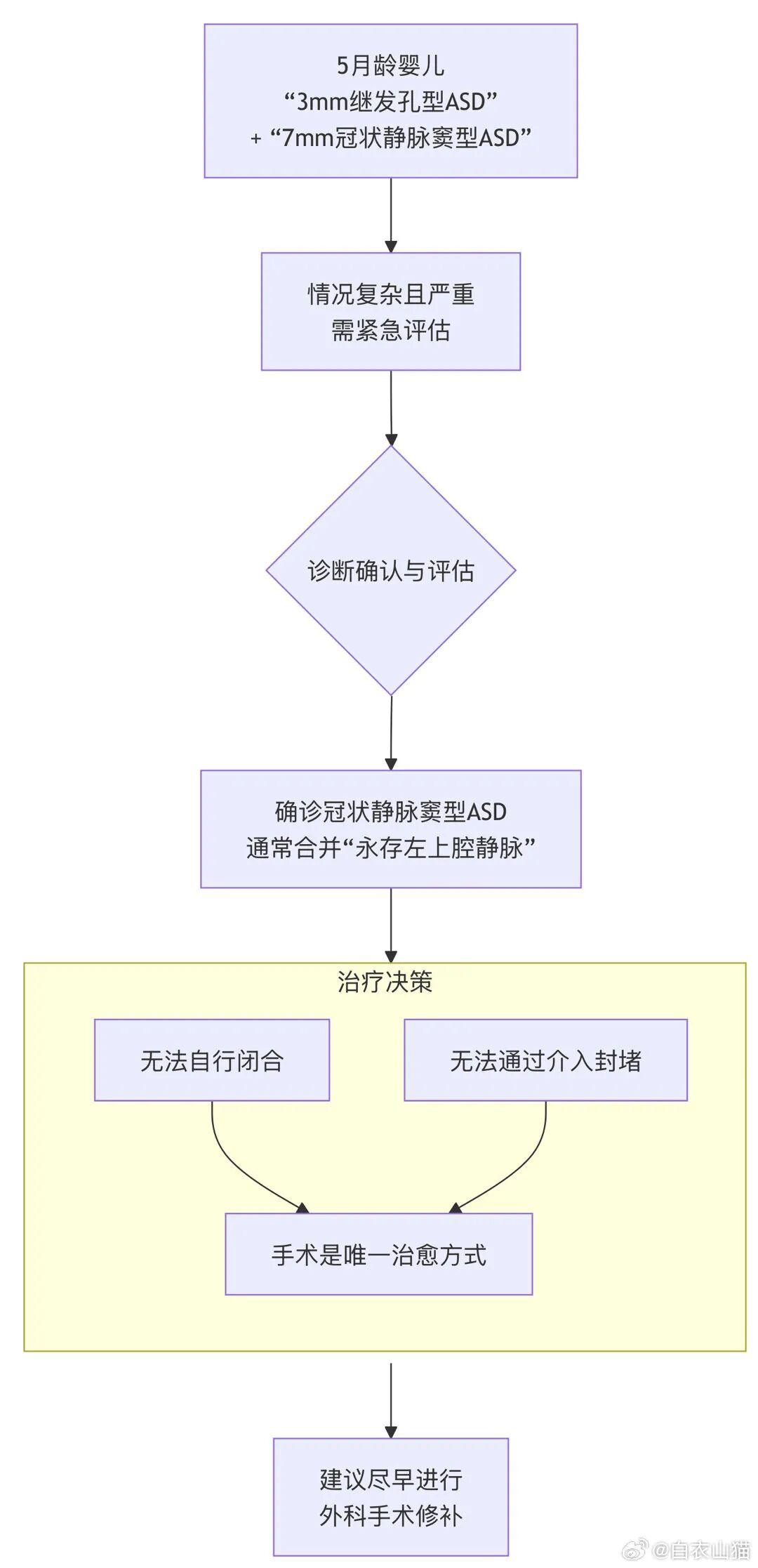1、微博认证的“浙江援疆外科副主任医师”博主@白衣山猫 表示:冠状静脉窦型缺损位置特殊,易合并血管畸形,需早期手术。